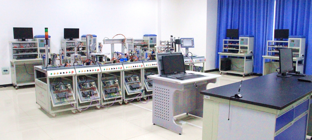 本实训室主要包含模块式柔性自动化生产线(八站系统)1套,立体停车库实训装置5套。涵盖相关专业课程学习中所涉及的PLC控制、单片机控制、传感器检测、电动系统、气动系统、机电传动系统、现场总线系统、HMI设备等的综合应用范例,为学生提供了将相关专业技术课程进行融合和提升的综合操作平台。