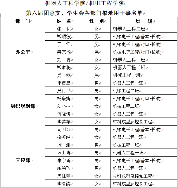 为进一步扩大学生干部选拔任用工作中的民主,认真贯彻公开公正原则,强化对学生干部选拔任用工作的监督,选准用好学生干部,进一步提高选人用人公信度,根据“机电工程学院学生干部选拔任用工作条例”等有关规定,经过本人自荐、集中面试等程序,经学院团总支、学生会研究,报学院党总支批准,拟决定录用张亿、郑顺波等103位同学(见附件)为机器人工程学院/机电工程学院第六届团总支、学生会各部门干事,现予以公示。公示期从2018年9月22日起,至2018年9月24日止。