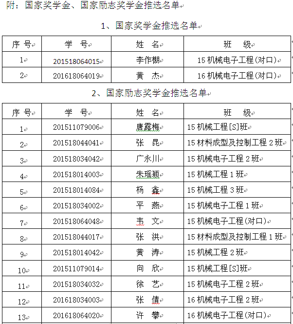 附:国家奖学金、国家励志奖学金推荐名单