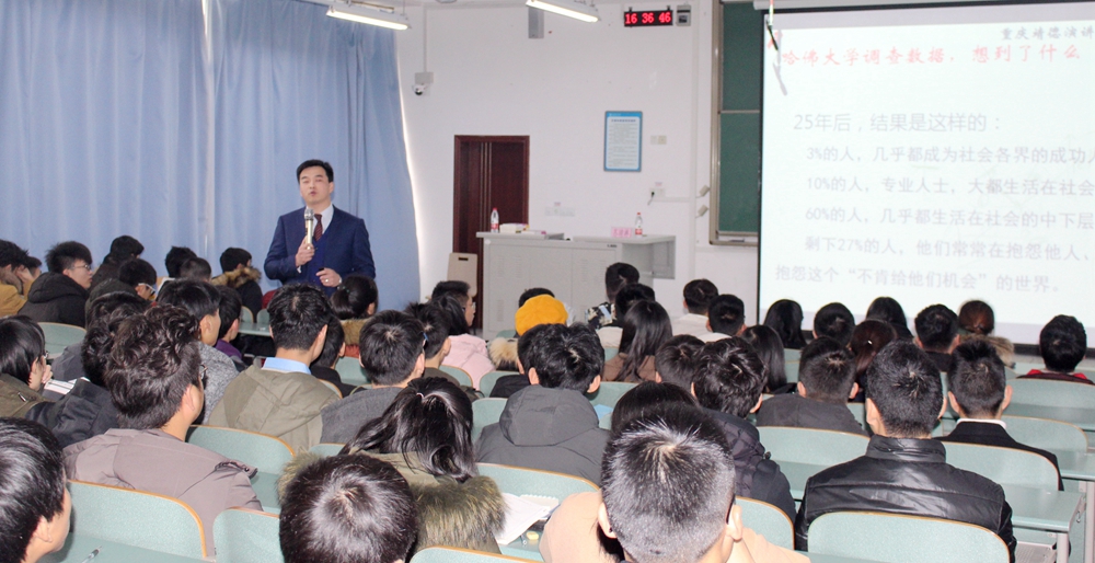 12月19日下午,2018年校友论坛系列活动之“如何玩转大学——大学生的生涯规划”讲座在知行楼B601举行。讲座特邀2006级电子信息科学与技术专业毕业校友、重庆靖德教育知识体系创始人苏靖淋主讲。学院党总支书记、校友分会会长曹勇主持。2018级全体学生聆听了本次讲座。