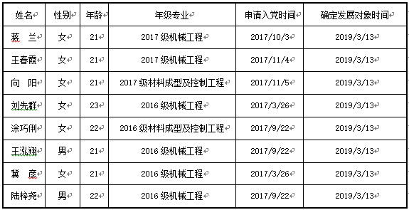 按照发展党员工作有关文件要求,严格执行发展党员的程序,在广泛征求党内外群众意见的基础上,经支委会政审、学校党委组织部预审合格后,拟将王泓翔、蒋兰等8名同志发展成为中共预备党员。现将发展对象的基本情况公示如下: