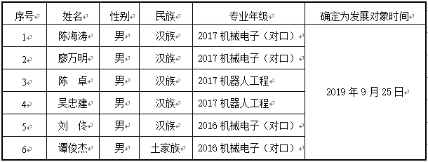 根据《中国共产党发展党员工作细则》的规定和《关于2019年上半年入党积极分子培训和发展党员工作计划的通知》的要求,经入党介绍人推荐,并征求专业教师、辅导员和班级群众座谈会意见,经学生第二支部委员会9月25日开会讨论,拟确定陈海涛、廖万明等6名同学为党员发展对象。现将有关情况公示如下: