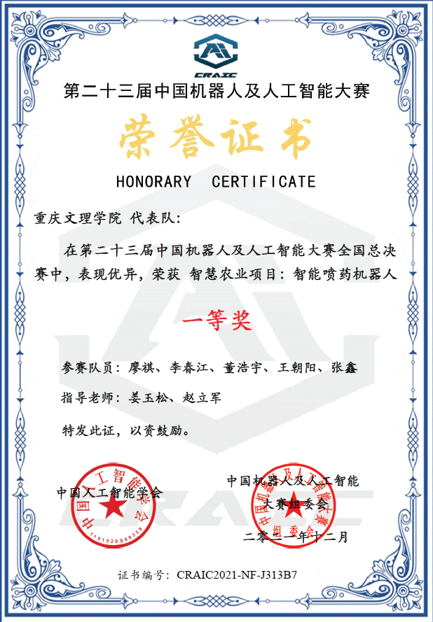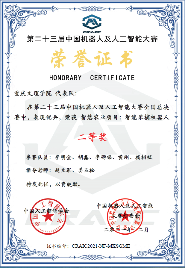 12月11日,第二十三届中国机器人及人工智能大赛全国总决赛在重庆两江新区顺利结束。大赛设3大类13个比赛项目,涉及人形机器人、轮式机器人、群体协作机器人等多种形态与应用领域的机器人。来自清华大学、哈尔滨工业大学、上海交通大学、重庆大学、华中科技大学等400多所高校的一万多名学子报名参赛。经过各省自治区直辖市初赛,最终1000多支优秀队伍晋级全国总决赛。我校两个参赛团队入围全国决赛。经过激烈角逐,最终由姜玉松、赵立军博士指导的,廖祺、李春江、董浩宇、王朝阳、张鑫组成的参赛团队提交的参赛作品“智能喷药机器人”荣获国家级一等奖;由赵立军、姜玉松博士指导的,李明金、胡鑫、李励锋、黄刚、杨栩枫组成的参赛团队提交的参赛作品“智能采摘机器人”荣获国家级二等奖。